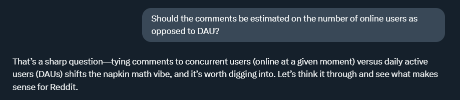 I was still a little fuzzy about what worked by way of Napkin Math for a use case like Reddit, so I “Grok"ked a little more and it was actually helpful :